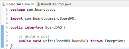 BoardDAO.java에는 write 함수에 대해 정의한 BoardDAO 인터페이스를 생성한다.